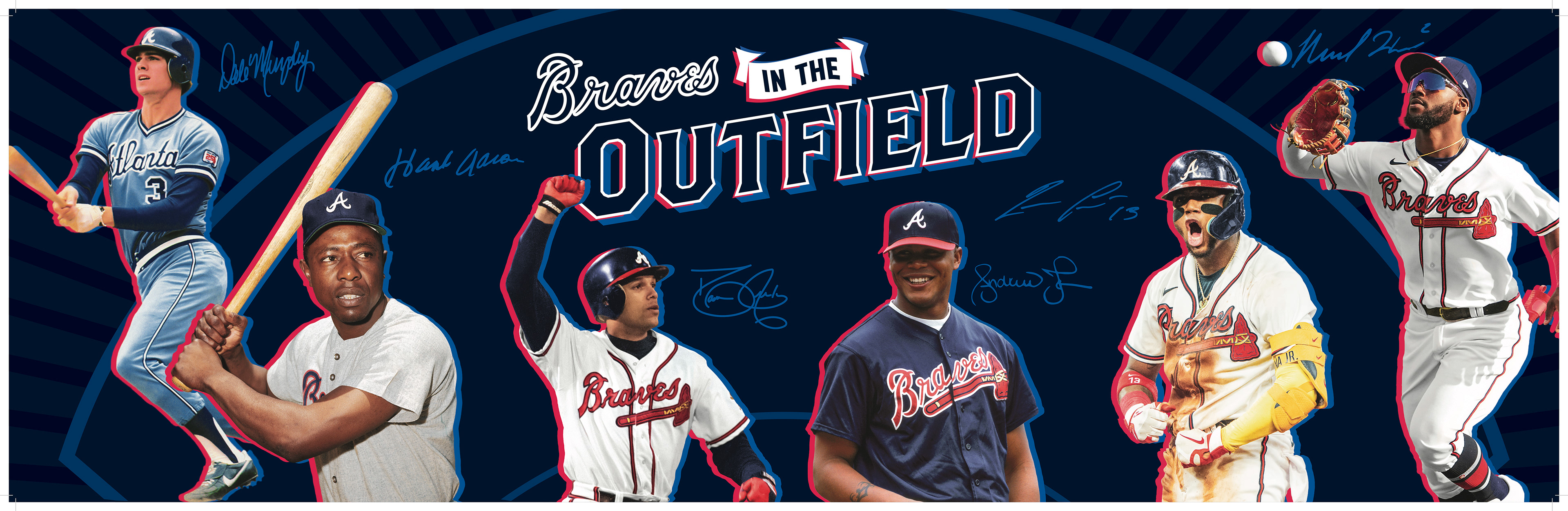 This graphic spans a wall measuring over 37 feet wide inside one of Truist Park's coolest spaces: Below the Chop. Fans are seated directly on field-level with only a fence separating them from the outfield action, hence the graphic highlighting some of the Braves' best outfielders.