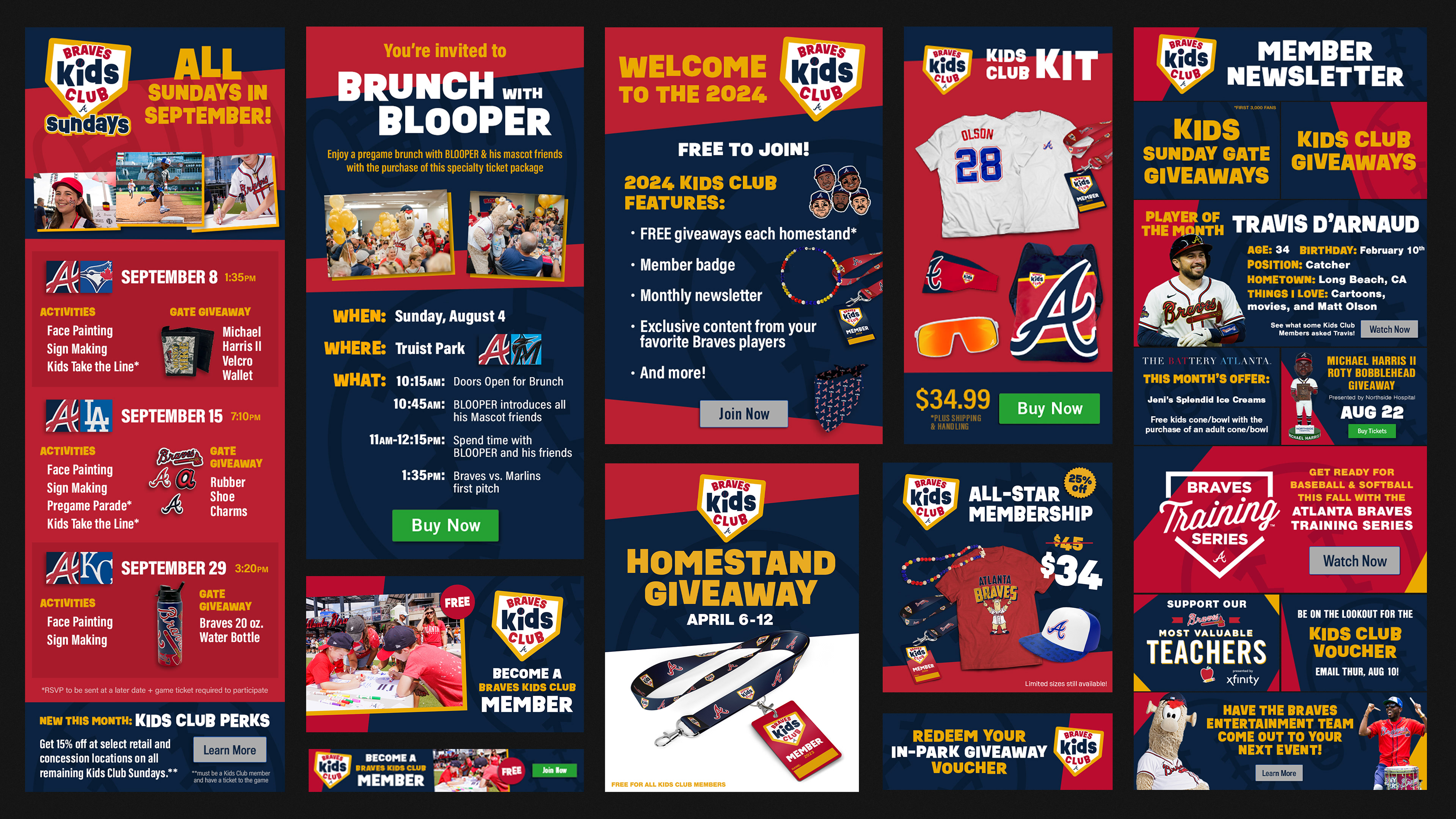 In 2022, I designed the branding for the Braves Kids Club, a free offering for Braves families. This brand extends across digital mediums (emails, web advertising, and paid social advertising), hard goods (giveaway items like hats, bags, etc.), and environmental assets (signage).