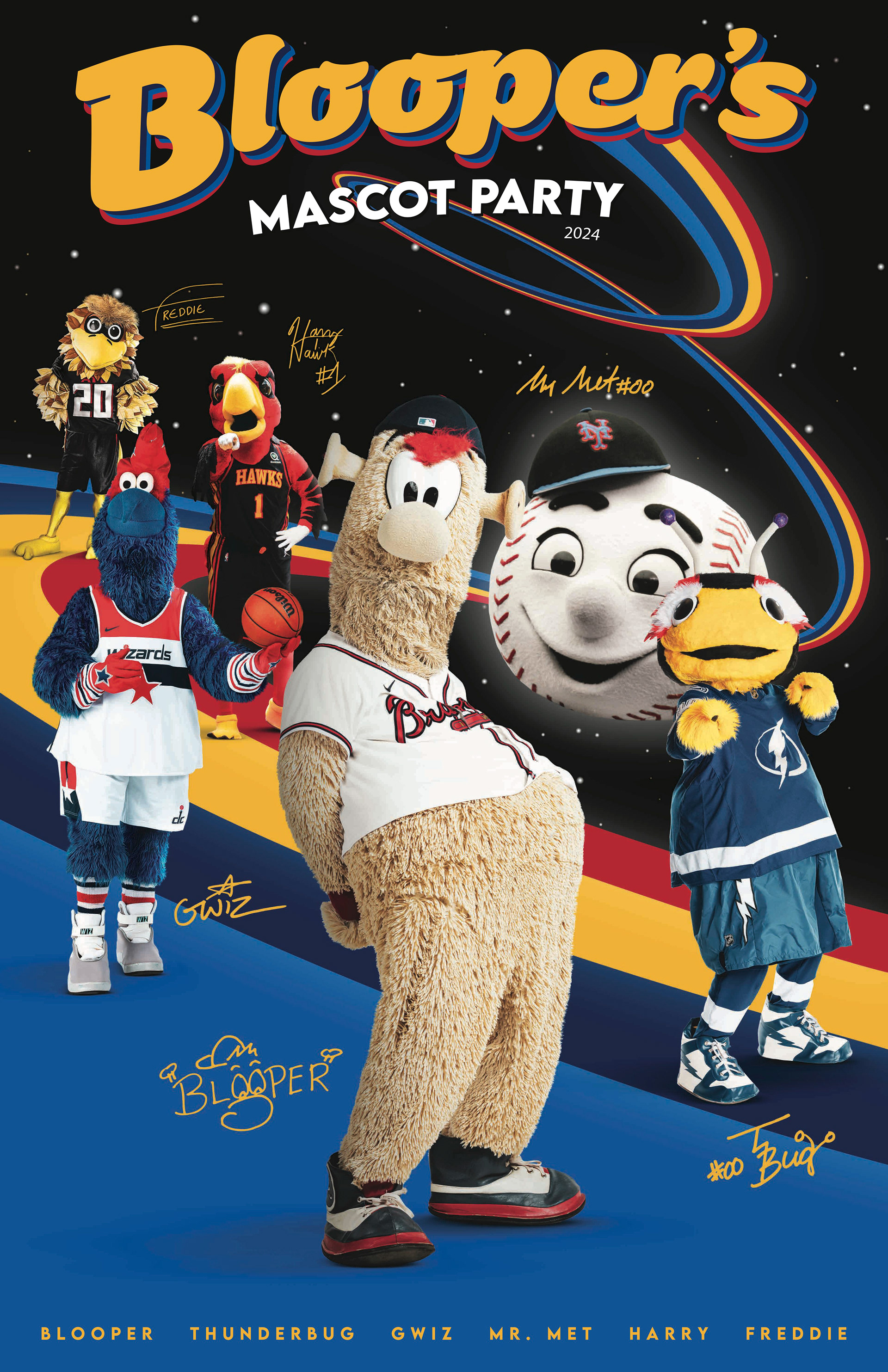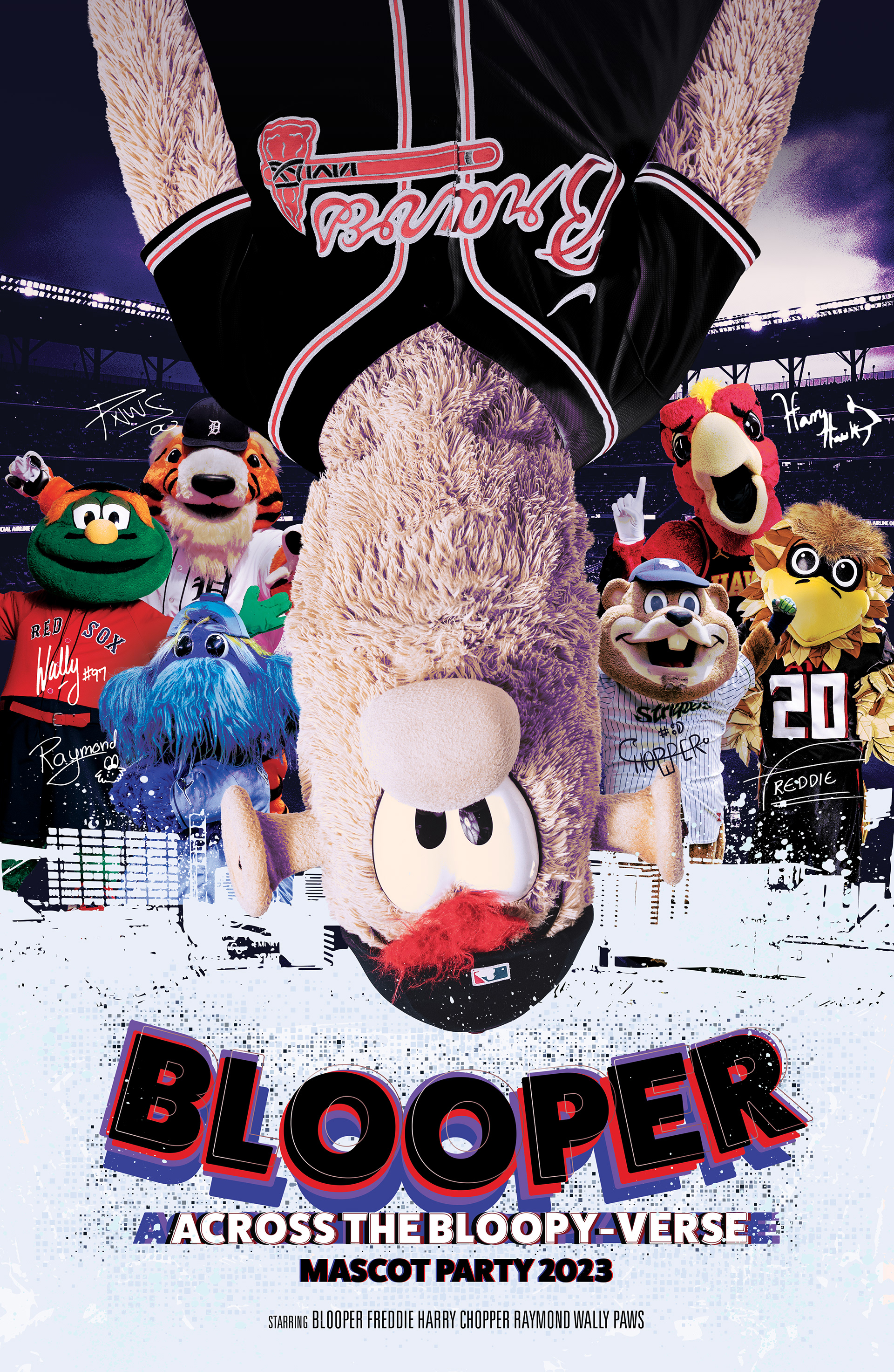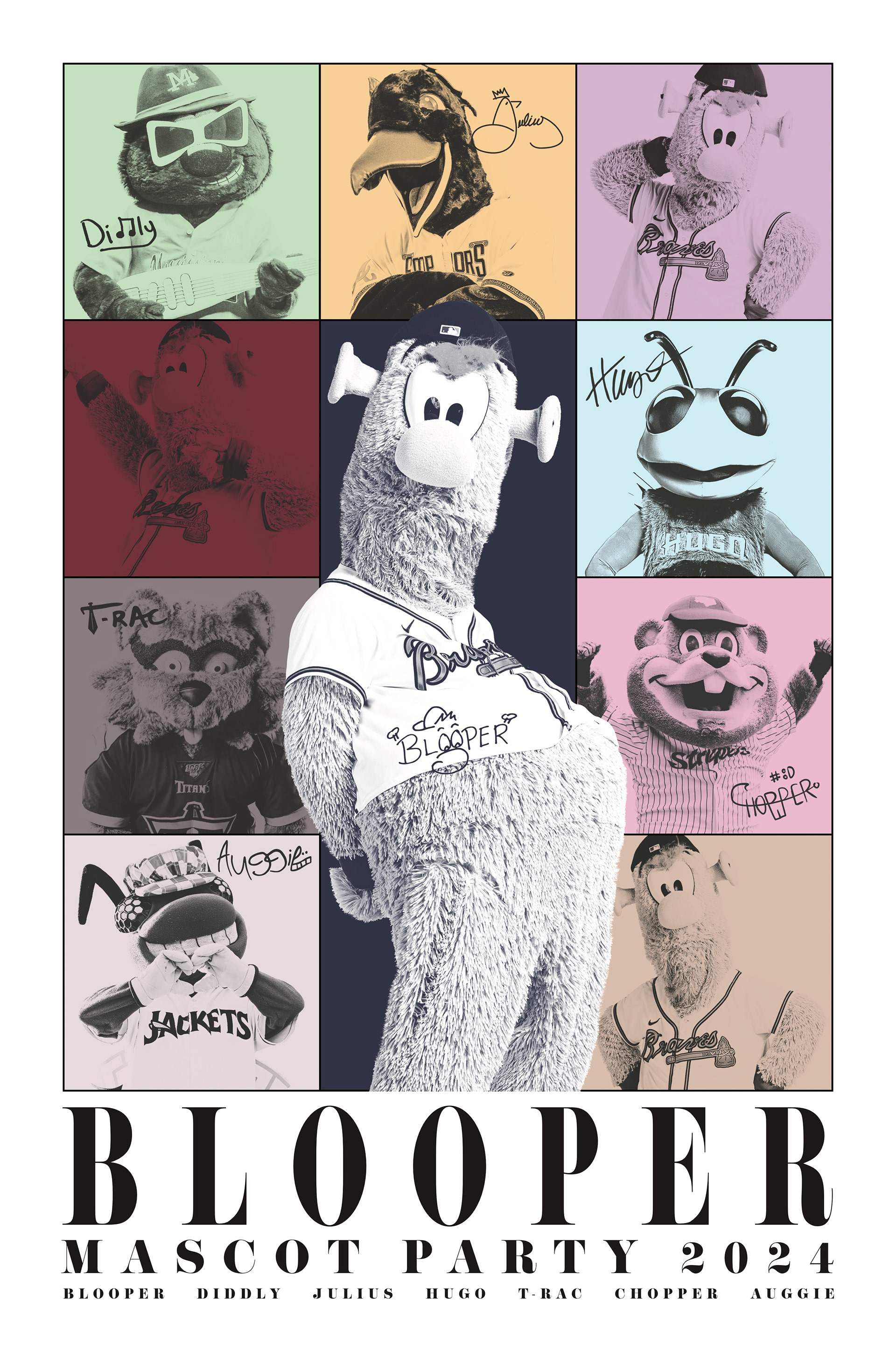I created these posters for Blooper, the Atlanta Braves Mascot, and his annual mascot parties. The goal for these was to theme them around pop culture, matching Blooper's eccentric voice on social media. Fans received a free copy for attending the party.